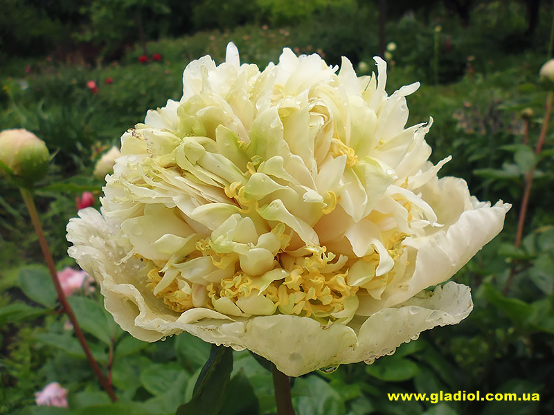 Махровий бомбоподібний кремово-білий з рожевим підсвічуванням та численними лимонно-зеленими петалодіями